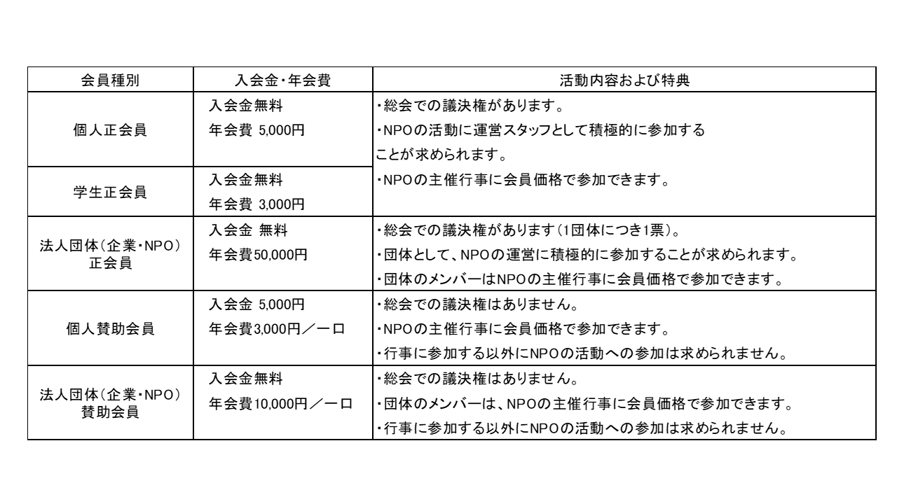 - 特典として、NPOの主催行事(吉田塾)に会員価格で参加できます。また、会員限定の視察旅行等にも参加可能です。参加したいそれらの行事に参加いただく以外に、NPOの活動への参加は特に求められません。